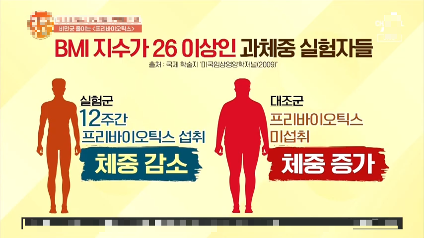 실제로 BMI 지수가 26 이상인 48명의 건강한 성인을 대상으로 12주 동안 한쪽 그룹에만 프리바이오틱스를 섭취하게 했는데요. 그랬더니 프리바이오틱스를 섭취한 그룹은 체중이 감소한 반면 섭취하지 않은 그룹은 오히려 체중이 늘어났다는 연구 결과가 있습니다.