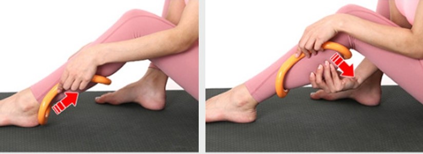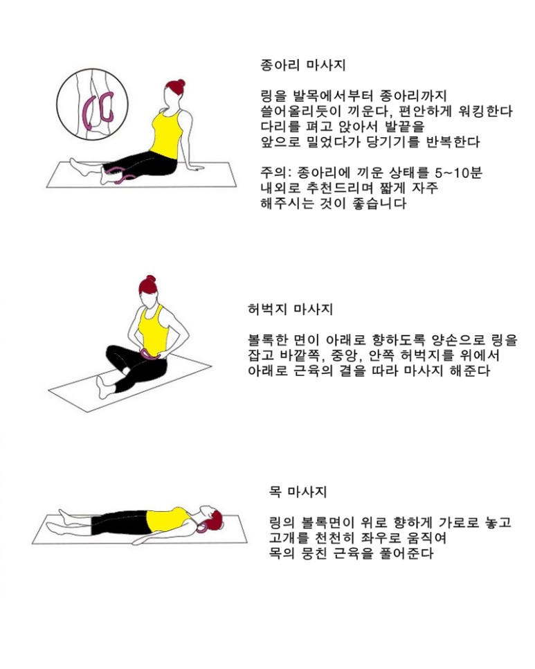 요가링 착용이 힘들거나 빠진다면 요가링 안에 종아리를 넣은후 압박하여 마사지할 수 있습니다